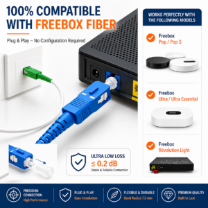 Câbles fibre SC/APC, modules SFP+ 10G, switches et convertisseurs — tous les accessoires compatibles Freebox Ultra.