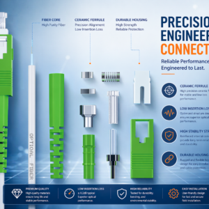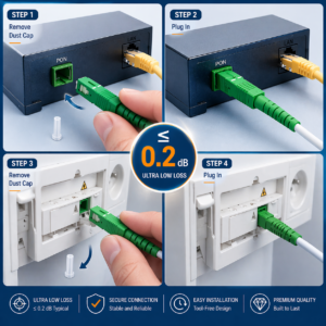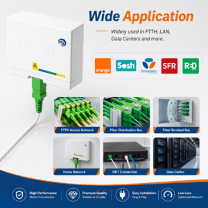 Jarretières, pigtails, adaptateurs, PTO, splitteurs — tout pour les déploiements FTTH et réseau campus.