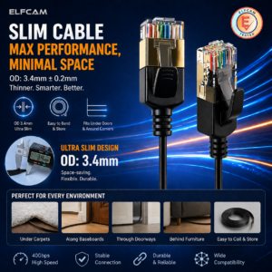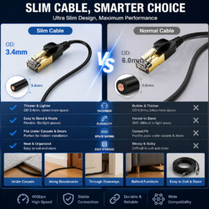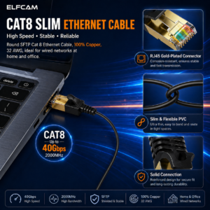 Elfcam® – Câble Ethernet Cat 8 Slim, Câble Réseau LAN WAN, Cat 8 SFTP 32AWG, 2000Mhz 40Gbps avec Connecteurs RJ45 Haute Qualité, Rond Noir