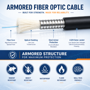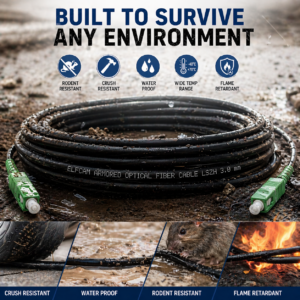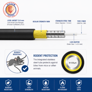 Armure acier, gaine PE 5 mm — liaisons inter-bâtiments, campus, milieux industriels. OS2 monomode ou OM3 multimode. −40 °C à +85 °C.