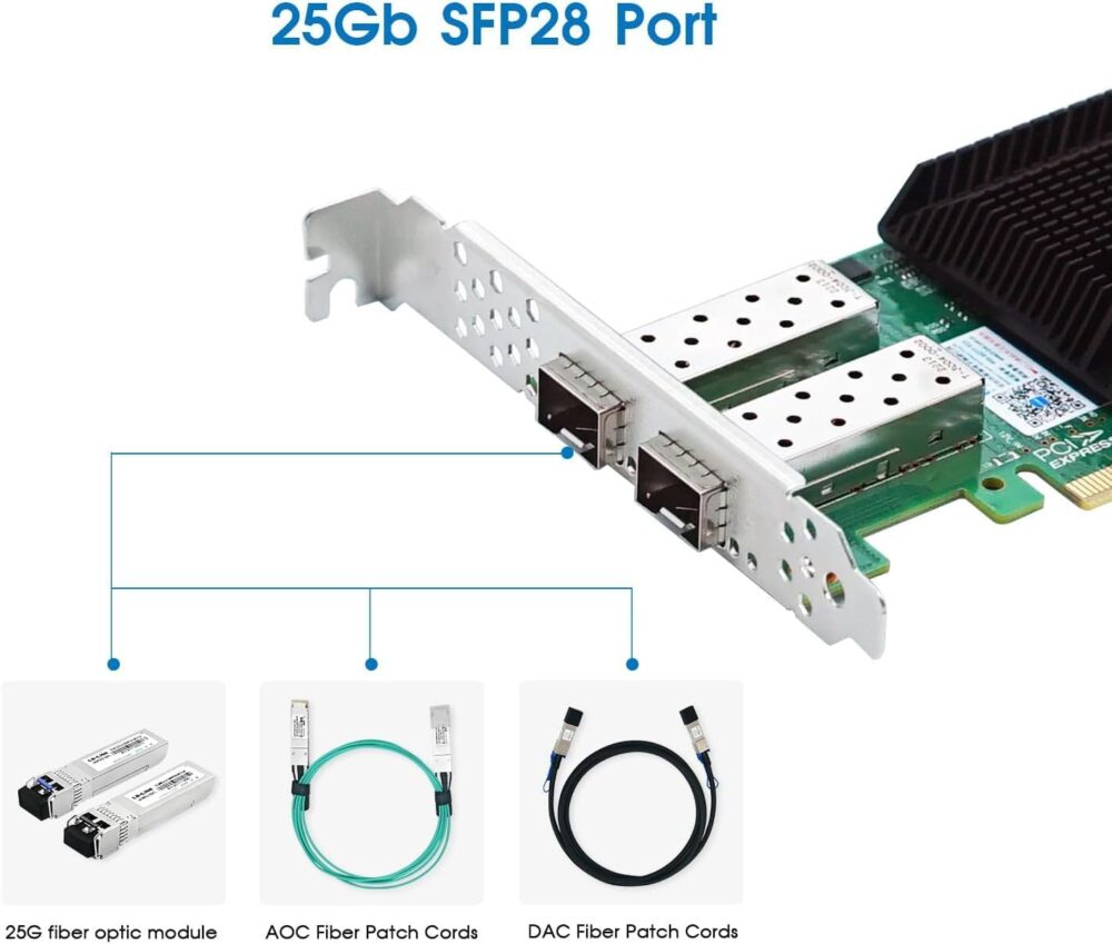 Elfcam® – 25Gb Carte Réseau PCIe avec Chipset Intel E810-XXVAM2, 25GbE Adaptateur Ethernet PCIe 4.0 X8 à 2 Ports SFP28, Adaptateur PCIe Ethernet LAN avec Contrôleur Intel E810 pour Win7/8/10/11 (Ref: 19566)