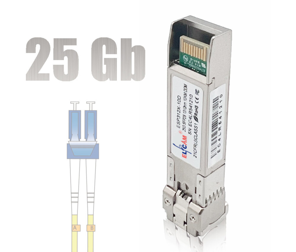 - Le transceiver SFP-25G-LR compatible SFP28 d’Elfcam offre un débit de 25GBase-LR jusqu’à 10km sur une fibre monomode (SMF) utilisant une longueur d’onde de 1310nm via un connecteur LC duplex.