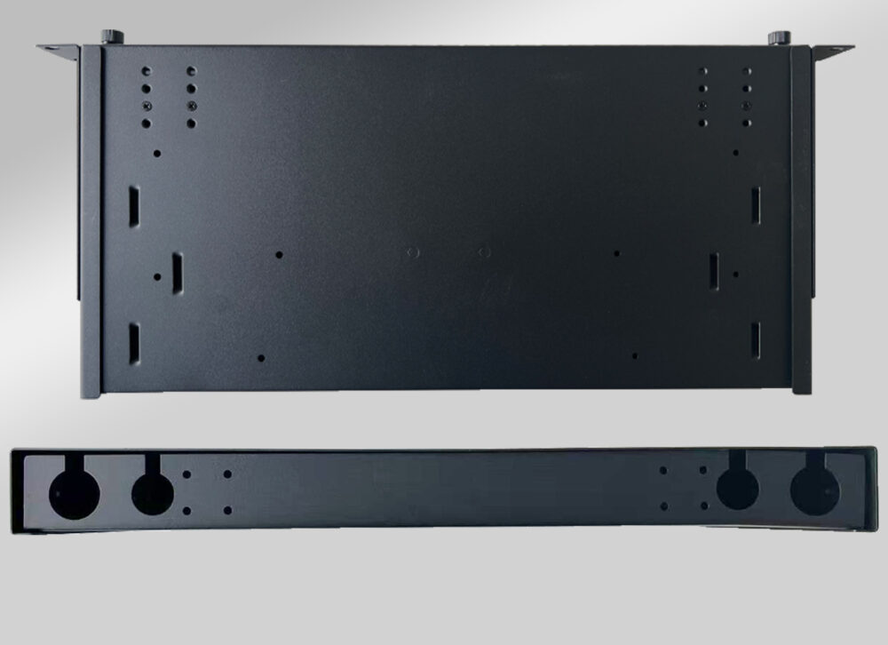 - Mise en oeuvre : Installation sur montant 19”. Tiroir en acier 1,5mm, Peinture époxy noir.