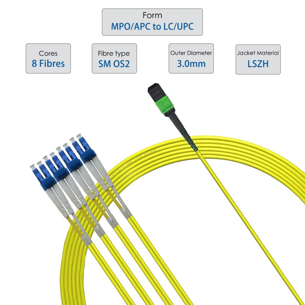 Elfcam – Câble Fibre Optique MPO/APC vers LC/UPC 8 Fibres Monomode OS2, Polarité de Type B, 8 Brins