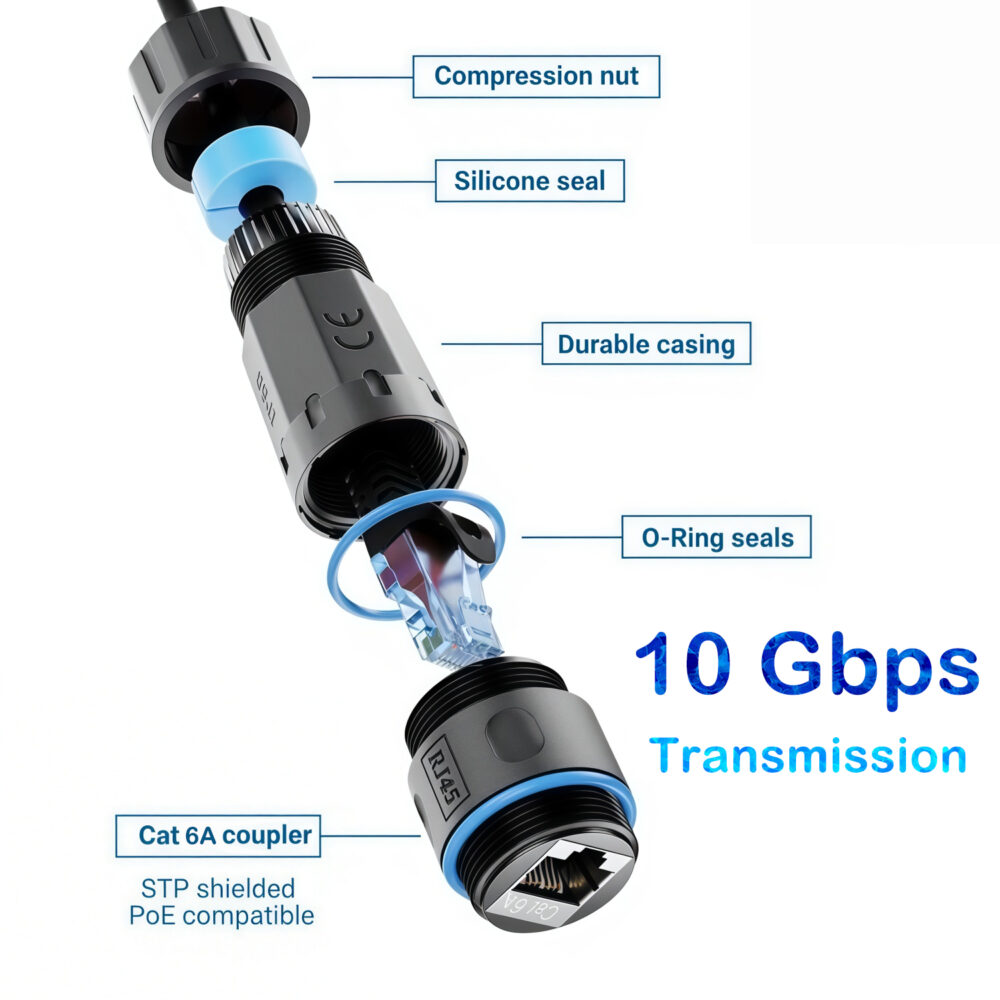 Ne laissez plus les intempéries interrompre votre réseau. Ce connecteur RJ45 étanche IP68 est la solution idéale pour prolonger une connexion Ethernet en extérieur, même dans les environnements les plus exigeants. Conçu pour les câbles Starlink, Cat6, Cat7, Cat8, ce coupleur Ethernet blindé assure une transmission de données fiable, stable et protégée contre l’eau, la poussière, et les interférences.