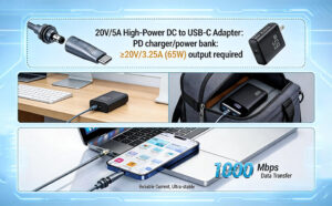 Exigences d’alimentation : L’alimentation standard doit supporter la fonctionnalité PD (Power Delivery) avec une sortie de 20 V et une puissance nominale de 65 W+.