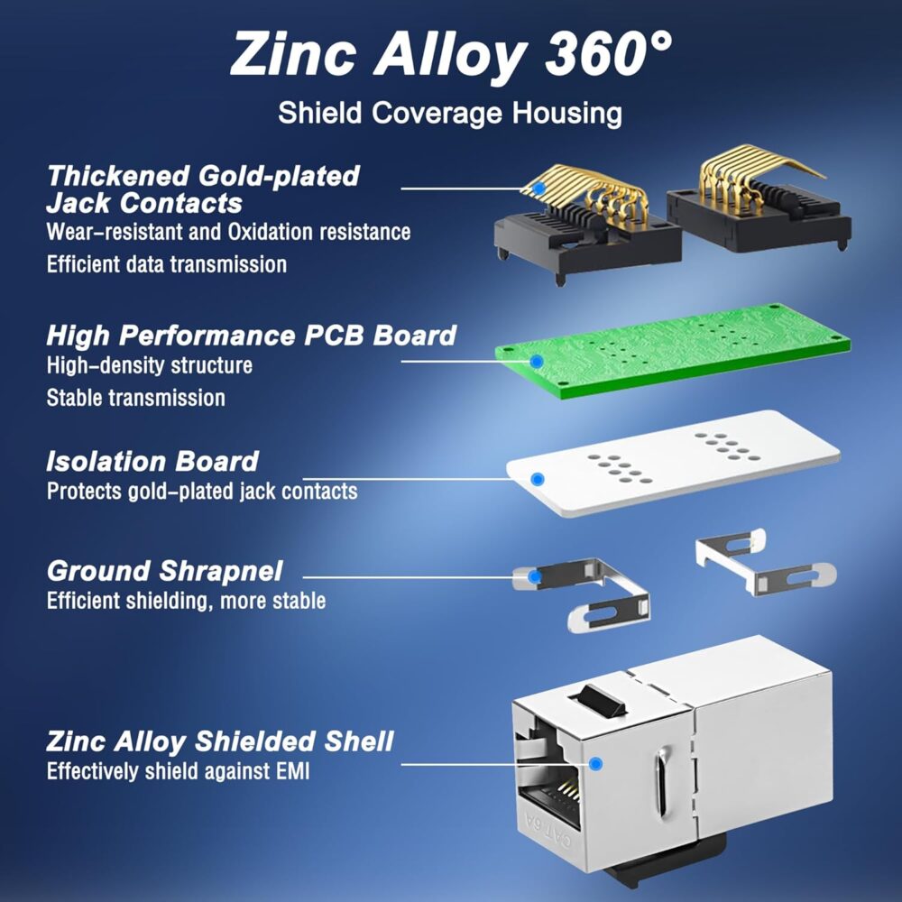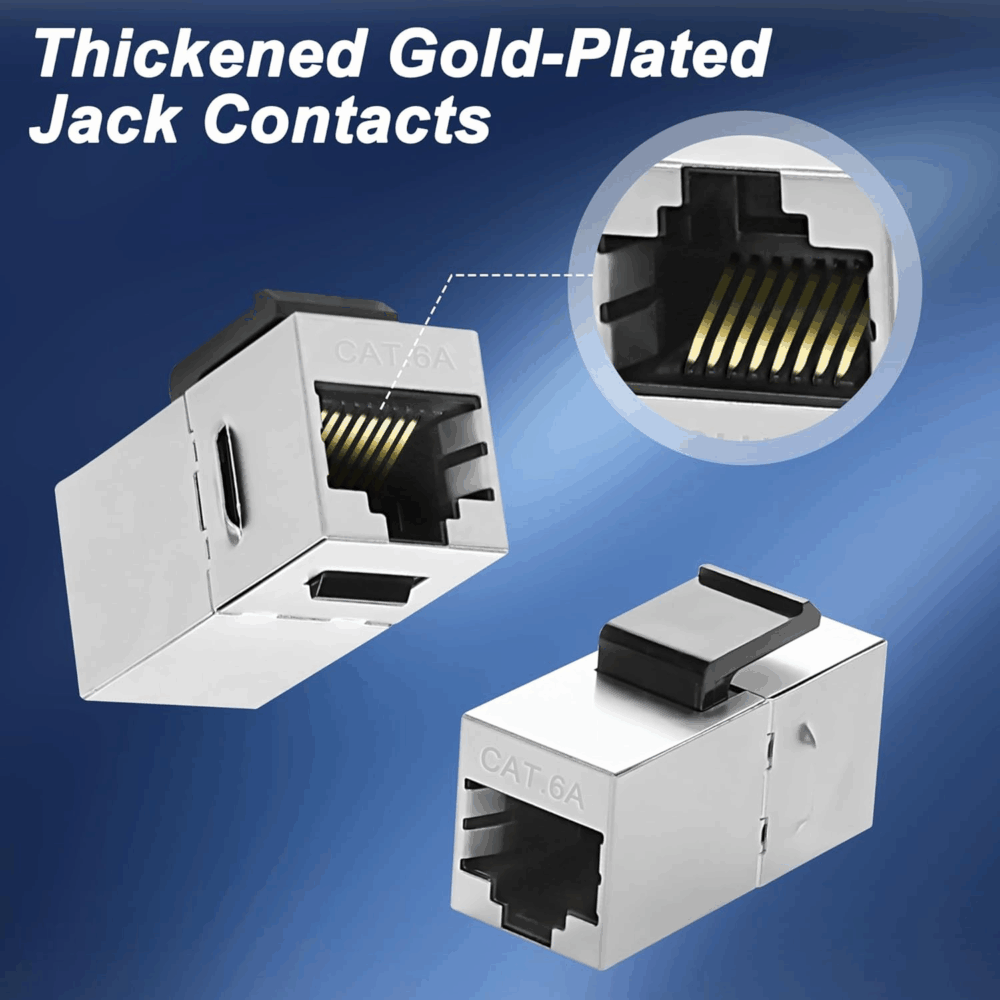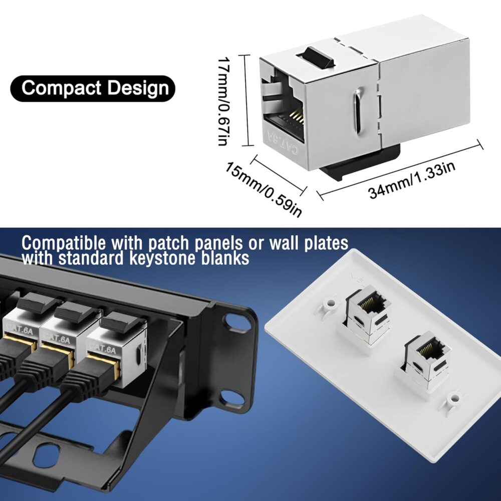 - Transmission haute vitesse : ce coupleur Keystone Ethernet RJ45 a les tentacules plaqués or cuivre pur pour assurer un signal fort et un transfert de données rapide, et la couche de protection de blindage entièrement métallique réduit les interférences du signal. Le coupleur jack Cat6 Keystone peut accélérer jusqu’à 1 Gbps, Cat6A peut accélérer jusqu’à 10 Gbps.