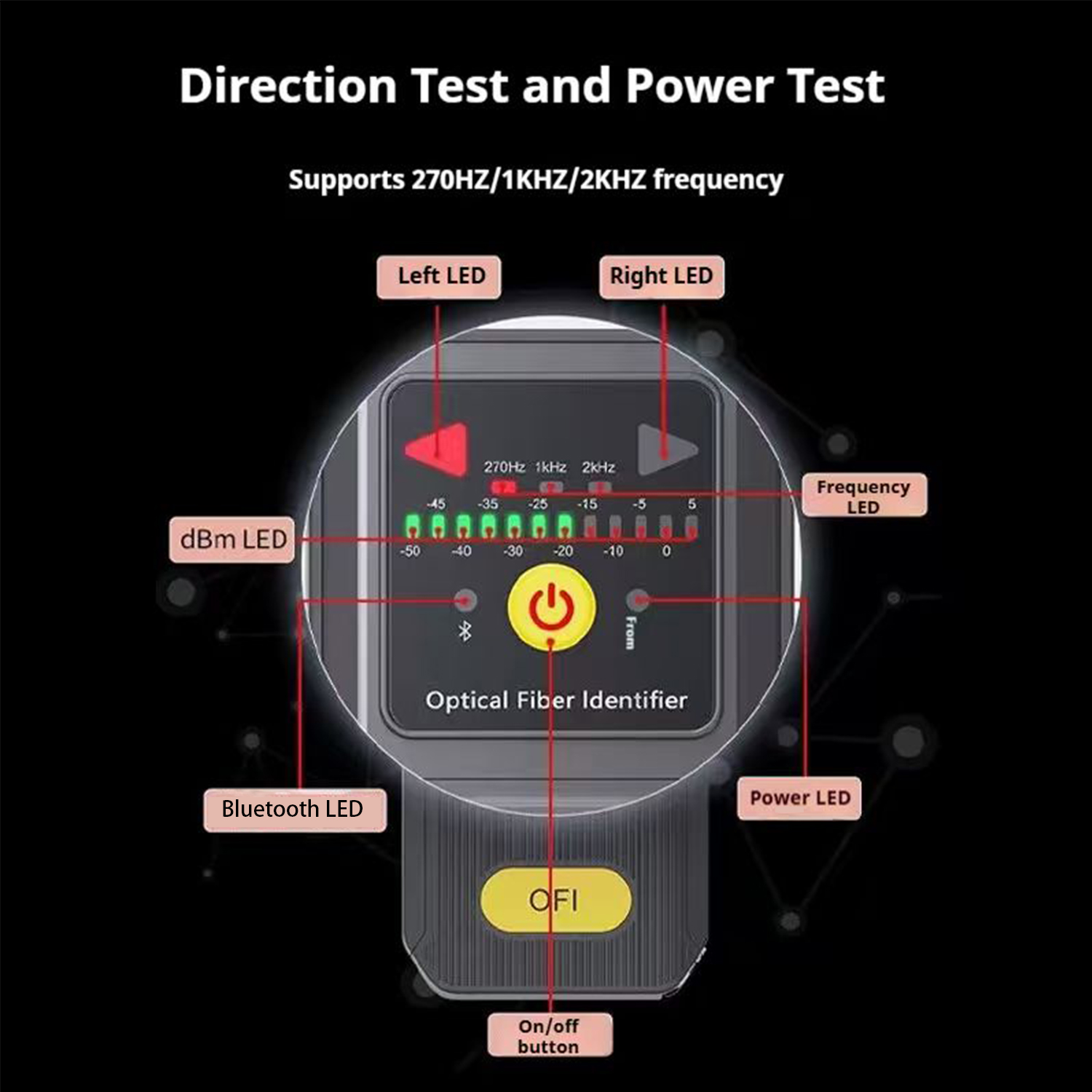 Indicateurs LED pour direction et puissance du signal Cet identificateur de fibre optique est équipé d’indicateurs LED rouges et verts très visibles. Le voyant rouge indique clairement la direction du signal optique, tandis que le voyant vert affiche l’intensité du signal. Il permet d’effectuer des tests sans interrompre la communication ni couper la fibre, avec une perte d’insertion ultra-faible <1 dB (1310/1550 nm)