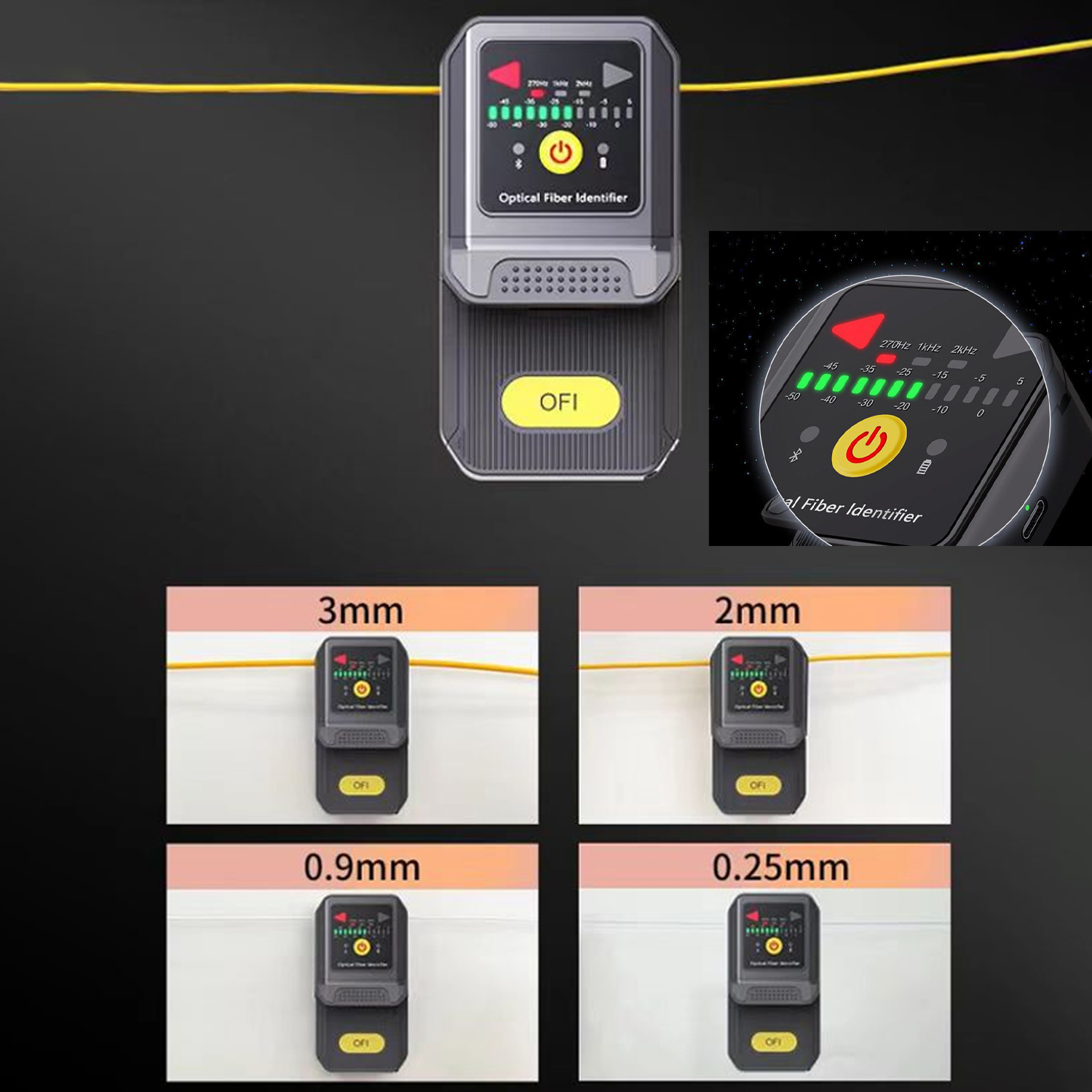 Compatible avec plusieurs diamètres de fibre Grâce à sa conception polyvalente, l’appareil permet de tester plusieurs types de fibres sans changer de pince :250 µm,900 µm,2.0 mm,3.0 mm,Il prend également en charge différentes fréquences de modulation (270 Hz / 1 kHz / 2 kHz) et longueurs d’onde 1310 / 1490 / 1550 nm, idéal pour les réseaux FTTH et la maintenance fibre optique.