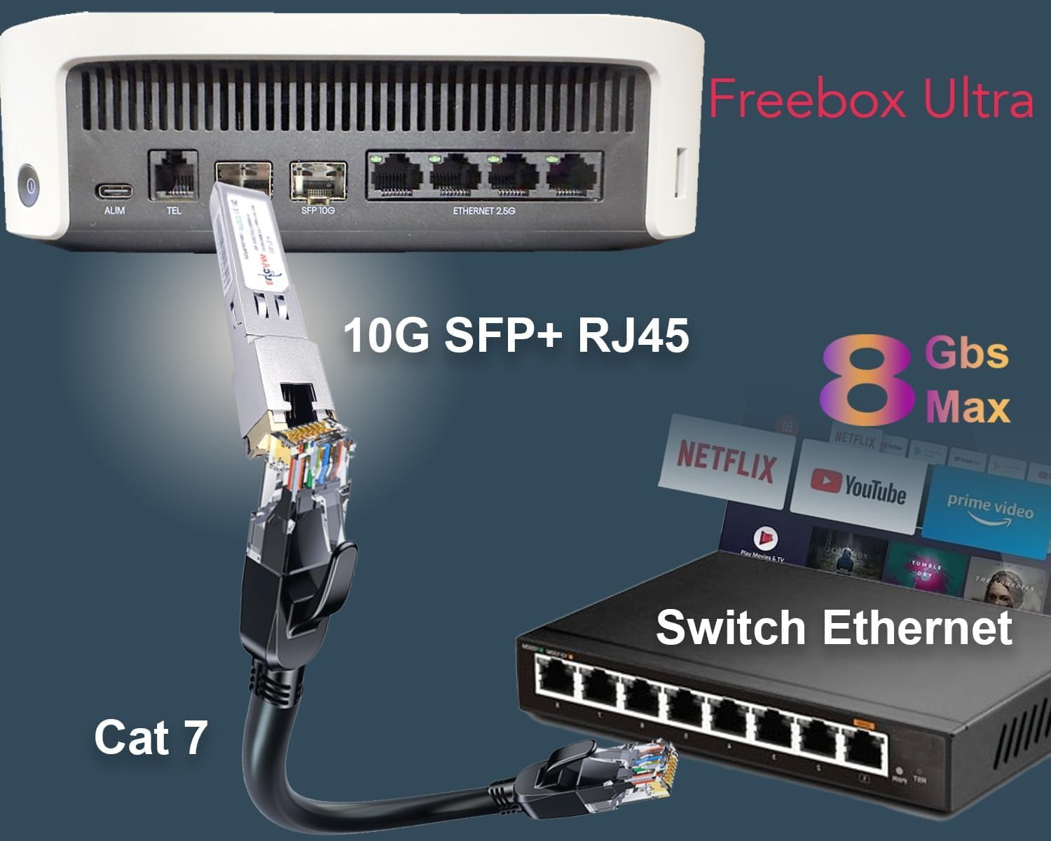 - 10Gb SFP+ en RJ45 Connecteur pour Freebox Ultra avec 1m Noir Cat8 Câble Réseau,Module émetteur-récepteur RJ45 10GBase-T SFP + cuivre, 10Go SFP+ pour Cisco SFP-10G-T-S, Ubiquiti, D-Link, Supermicro, Netgear, Mikrotik, Freebox Ultra et Delta, et open switch.