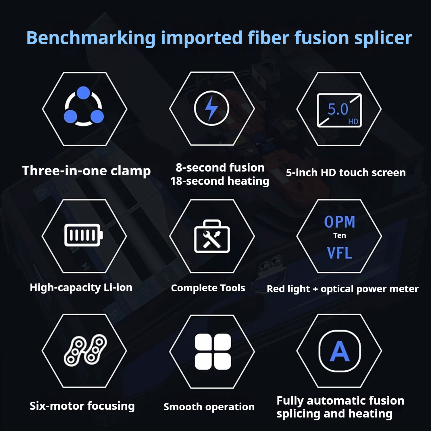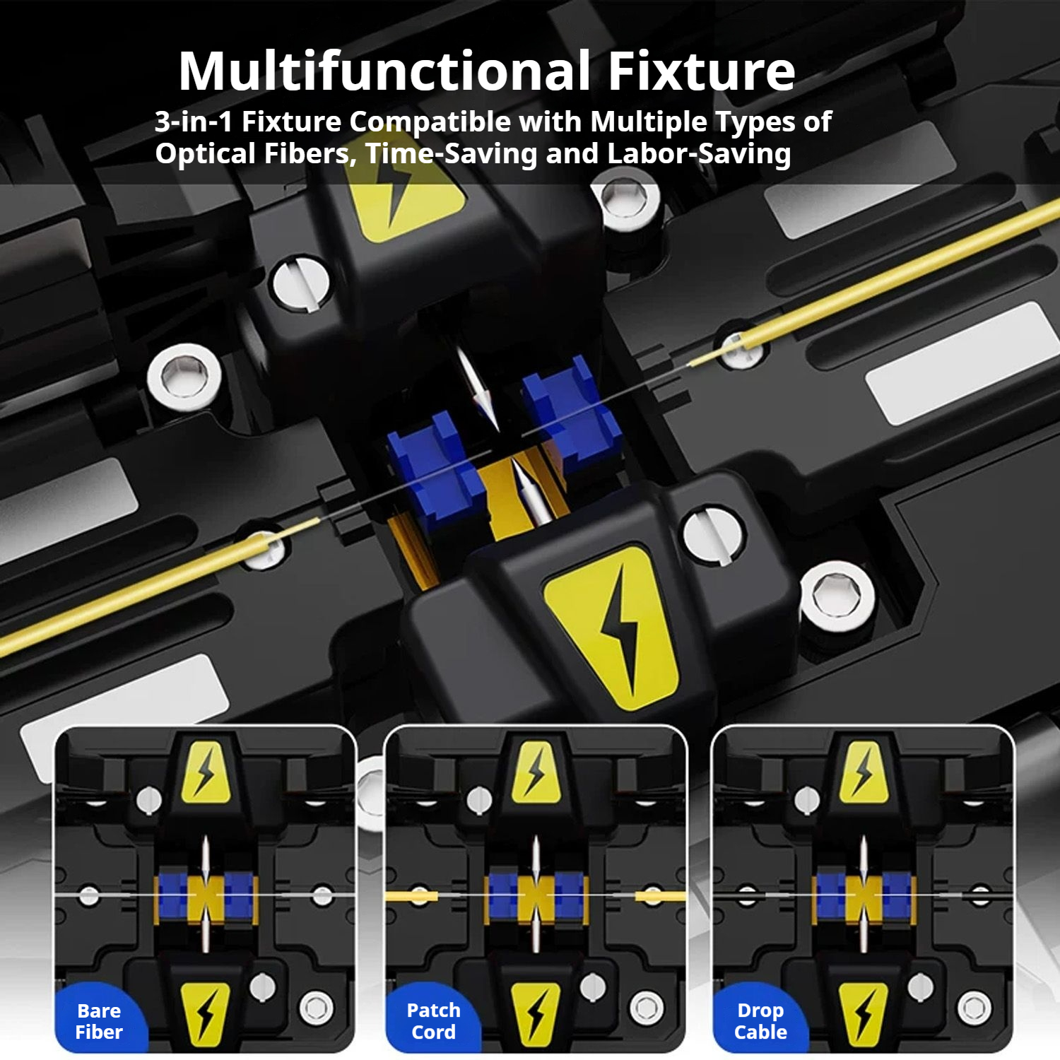 🔬 Fusion de précision exceptionnelle : La soudeuse K7 Pro utilise un alignement par noyau/gaine avec 6 moteurs pour une faible perte d’insertion (≤0,02 dB pour SMF). Compatible avec une large gamme de fibres : SM (G.652), MM (G.651), DSF (G.653), NZDS (G.655), diamètre de gaine 80–150 μm, revêtement 0,1–3 mm.