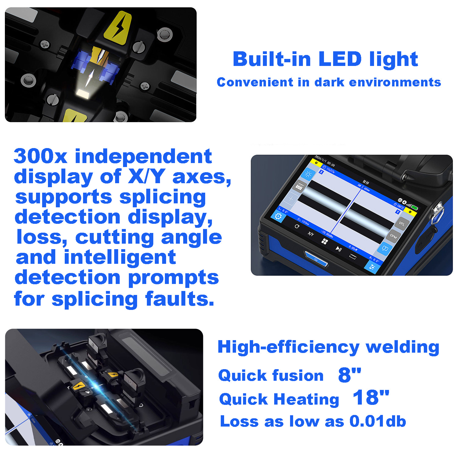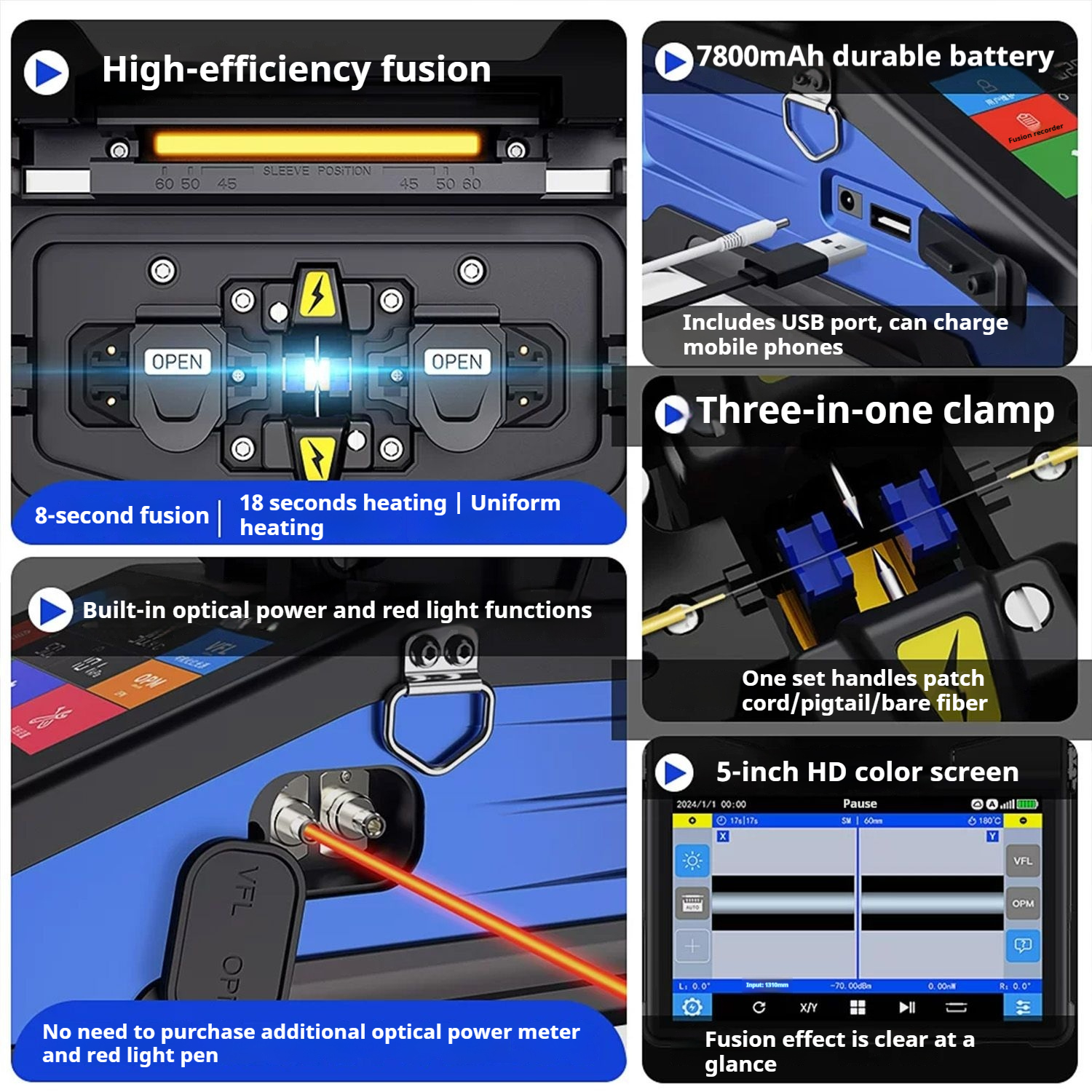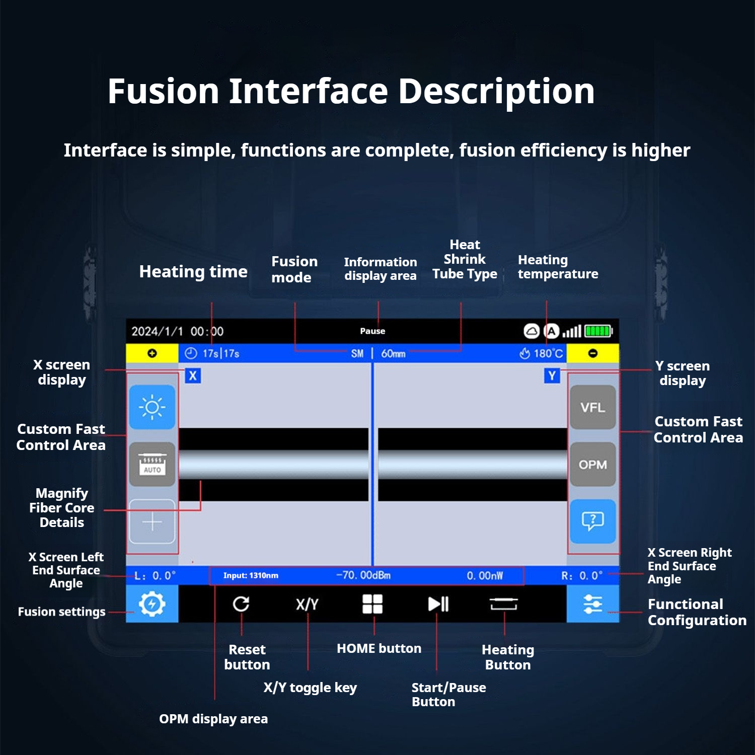📊 Fonctions intelligentes et connectées : Interface graphique intuitive, enregistrement de 10 000 journaux de fusion et 1 000 images. Détection automatique de la qualité des facettes, correction de l’usure des électrodes, options VFL (≥10 mW) et OPM (70 à +6 dBm) disponibles (selon version).