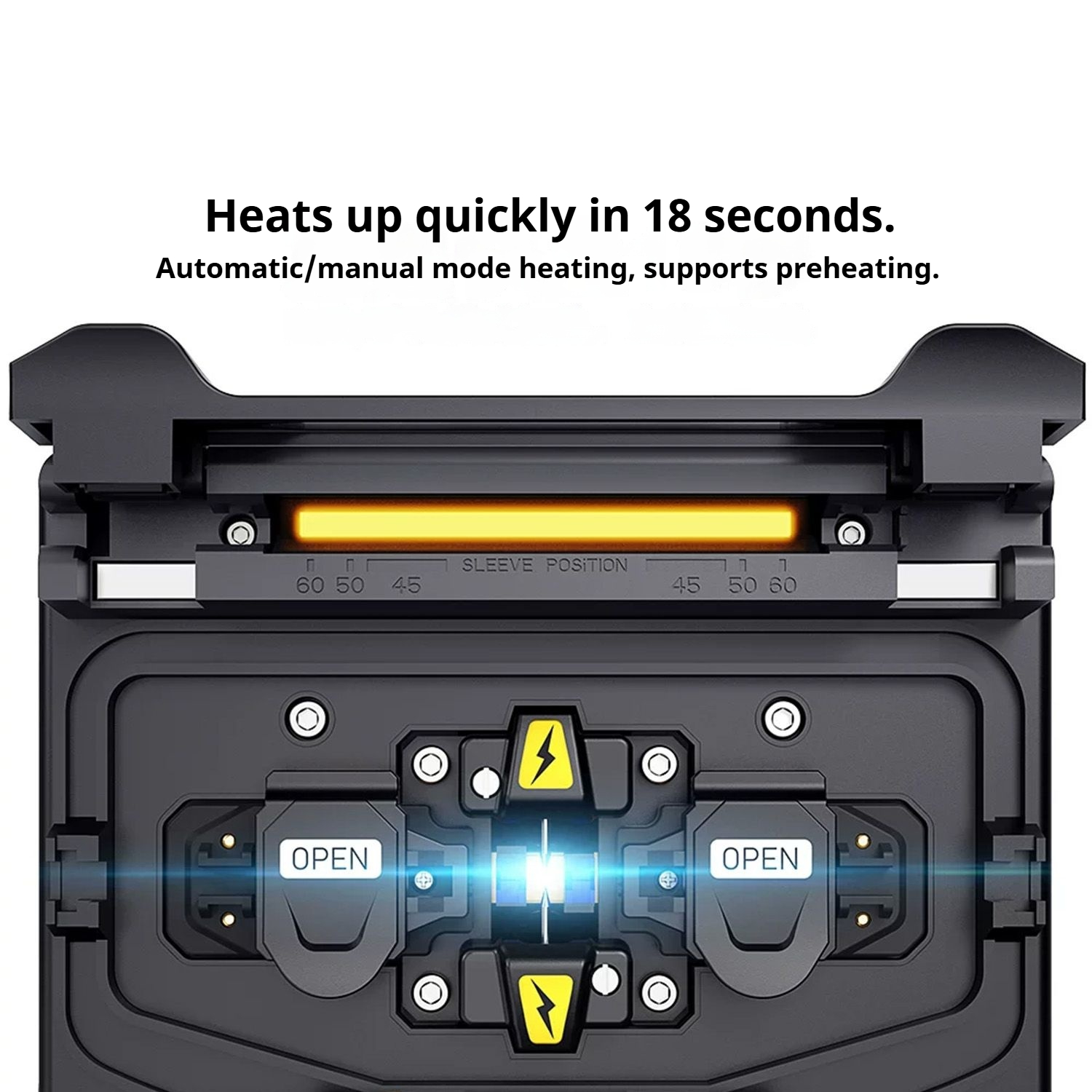 ⚡ Rapide et efficace : Temps de fusion typique de 8 secondes, temps de chauffage réglable de 0 à 60 s. Écran tactile capacitif 5″ avec grossissement 300× (vues X/Y et simultanée) pour un contrôle visuel optimal. Modes automatique et manuel disponibles.