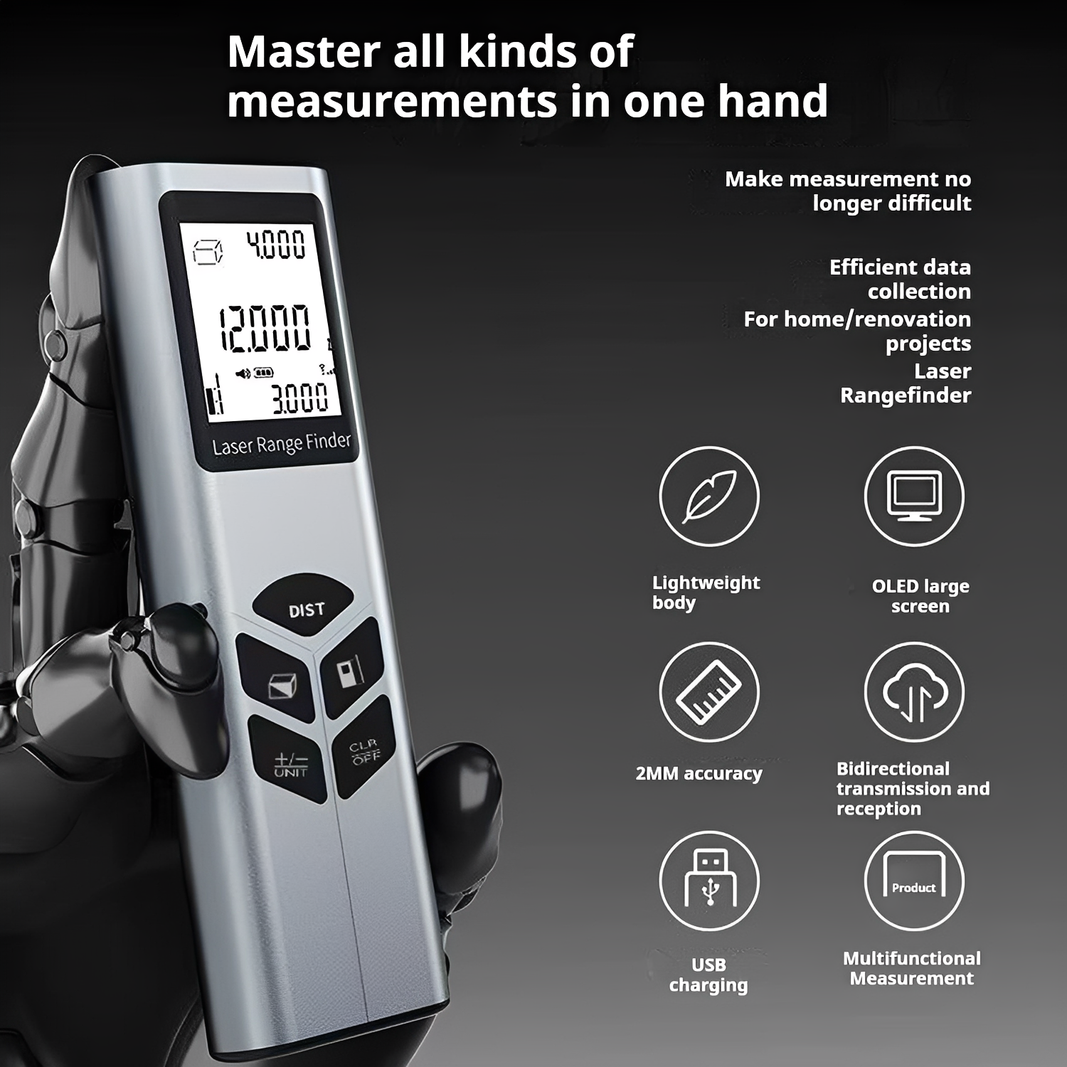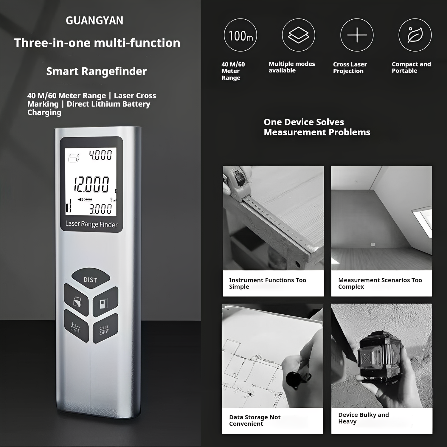 Télémètre laser J-40/J-60 – Mesure de distance 40 m/60 m, précision ±2 mm, fonctions surface/volume/Pythagore, écran LCD rétroéclairé, outil de mesure portable pour scénario bricolage et chantier.