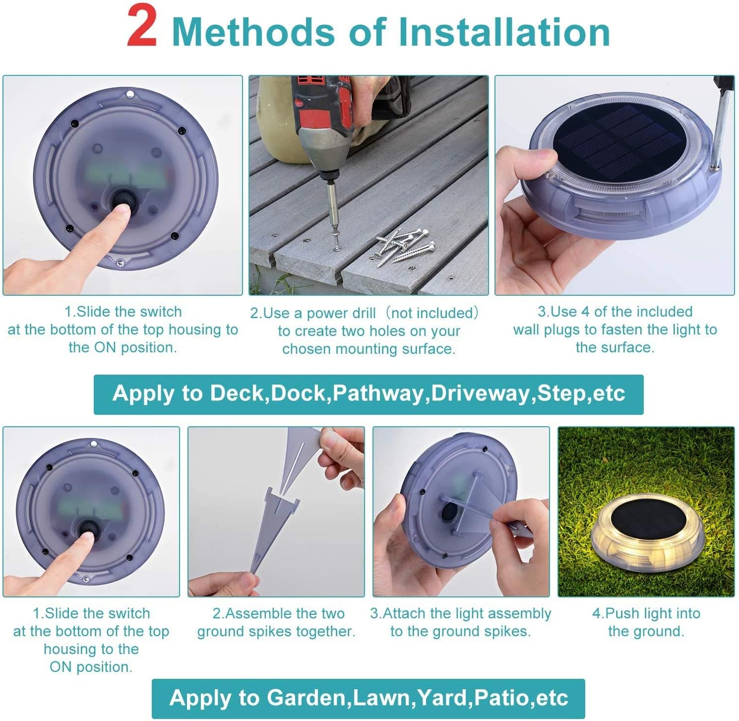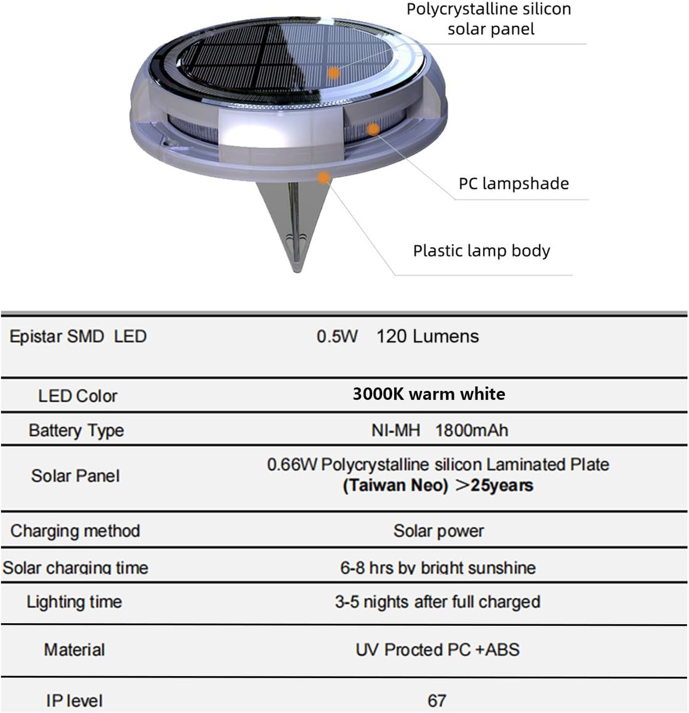 Éclairage décoratif chaleureux et élégant – Avec une lumière LED blanc chaud 3000 K et une intensité de 120 lumens, cette balise solaire crée une ambiance lumineuse douce et raffinée, idéale pour jardins, terrasses, allées, abords de piscine ou ponts de bateau, tout en améliorant la visibilité nocturne. Autonomie prolongée avec batterie haute capacité – Dotée d’une batterie rechargeable de 1800 mAh, cette balise solaire assure jusqu’à 3 à 5 nuits d’éclairage après seulement 6 à 8 heures de charge solaire. Une solution fiable et économe en énergie, même en conditions nuageuses ou hivernales. Allumage automatique crépuscule à aube – Le capteur crépusculaire intelligent allume automatiquement la lampe à la tombée de la nuit et l’éteint à l’aube. Profitez d’un éclairage d’ambiance sans effort, parfait pour les espaces extérieurs de détente et de réception. Installation simple, sans fil et polyvalente – Aucun câblage ni outil requis. Grâce au piquet conique, la lampe s’installe facilement dans le sol, les pelouses, les bordures ou les zones paysagées. Idéale pour jardins privés, chemins, terrasses, zones lounge ou espaces extérieurs premium. Ultra résistante pour environnements exigeants – Certifiée IP67, fabriquée en PC + ABS robuste, cette balise supporte jusqu’à 20 tonnes de pression. Résistante à la pluie, à la neige et aux projections d’eau, elle convient parfaitement aux abords de piscine, zones humides, jardins et utilisations extérieures durables, privées ou professionnelles.
