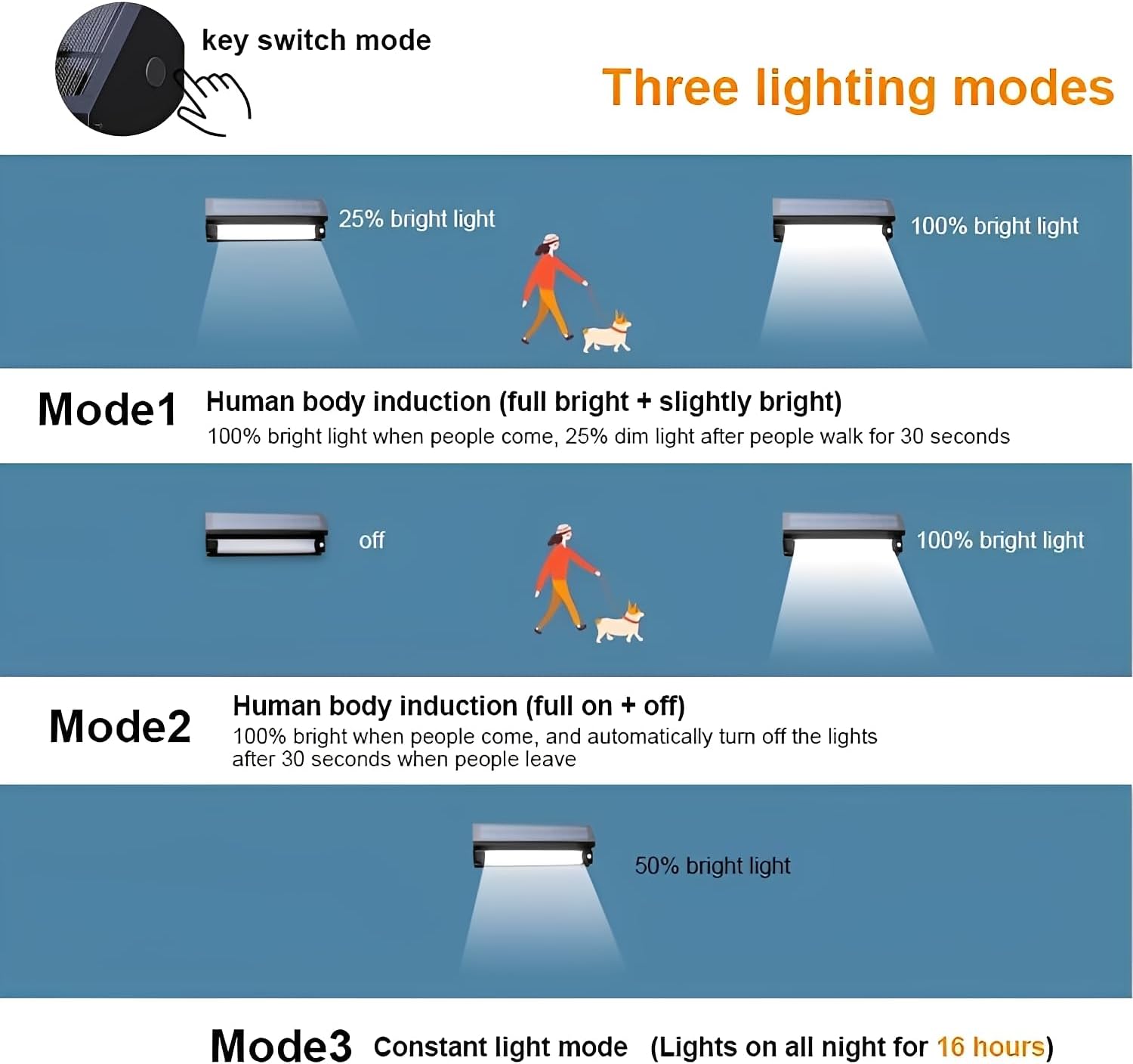 Détecteur intelligent avec 3 modes d’éclairage :Capteur crépusculaire + détecteur de mouvement intégrés avec 3 modes sélectionnables : – Mode 1 : Éteinte sans mouvement, 100 % à la détection puis arrêt automatique après 30 s – Mode 2 : 25 % en veille la nuit, 100 % à la détection puis retour à 25 % après 30 s – Mode 3 : Éclairage nocturne continu à 50 %, jusqu’à 16 heures d’autonomie