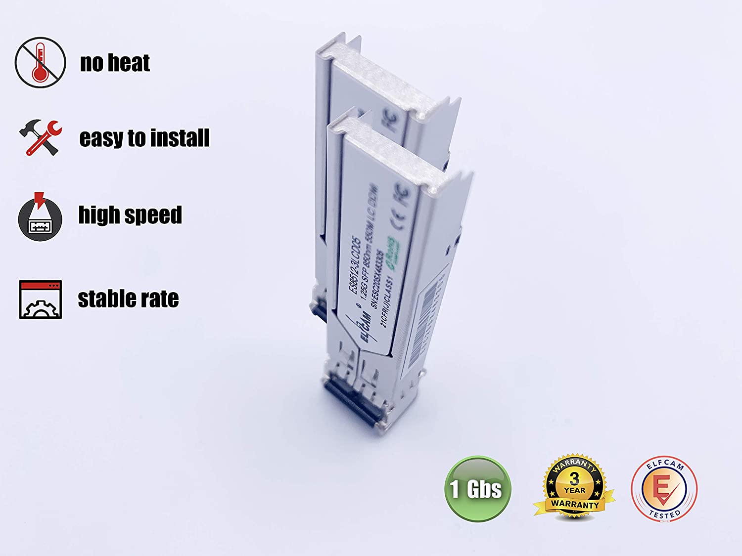 Le pack de 2 modules transceiver fibre optique Elfcam offre une solution de connectivité de pointe pour optimiser vos réseaux. Chaque module transceiver supporte jusqu’à 1,25 Gbps de débit de données, avec un connecteur LC/UPC en mode multimode pour une transmission fiable. Ces modules sont conformes aux normes MSA et SFF-8472, ce qui les rend compatibles avec divers équipements, y compris Cisco, Huawei et plus encore. Profitez d’une garantie de 3 ans et d’un support technique en français pour une tranquillité d’esprit totale. Commandez maintenant pour améliorer la performance de votre réseau avec Elfcam. Livraison gratuite en France, Belgique et Allemagne.