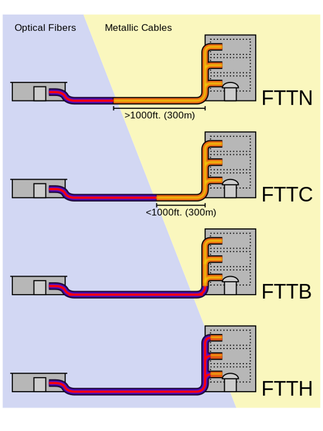 Le FTTC se distingue par son mélange de cuivre et de fibre optique, ce qui le rend moins coûteux à installer. Cependant, il n’a pas été conçu pour le long terme et sa bande passante potentielle est très limitée, tandis que le FTTP a été conçu pour pouvoir être étendu et amélioré.