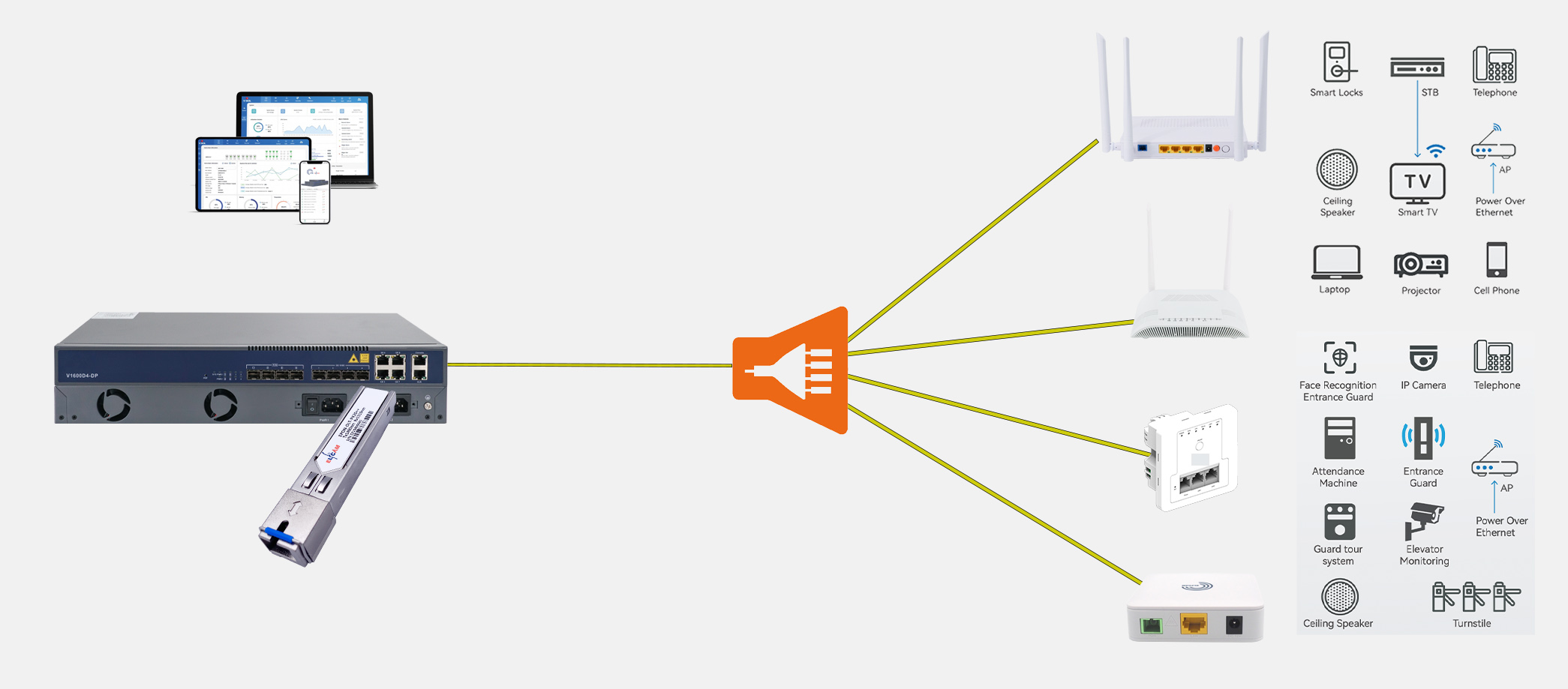 Une solution universelle proposé par ELFCAM très simple et très intégrale pour votre scénario. En choisir un XPON OLT, une SFP et vos ONUs (extensible à maximum 2048 ONUs) , vous allez profiter un reseau privé et extensible. ELFCAM a déjà réussi d’alimenter plus de 2000 cas en Europe pour les petites sociétés.